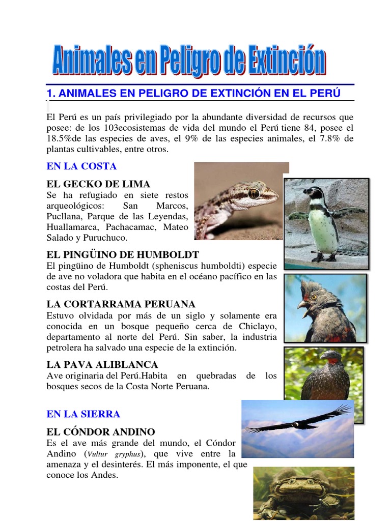 Los animales en peligro de extincion en peru conforman una lista de 535 especies de acuerdo a su norma legal. Condor andino caracteristicas del condor andino.