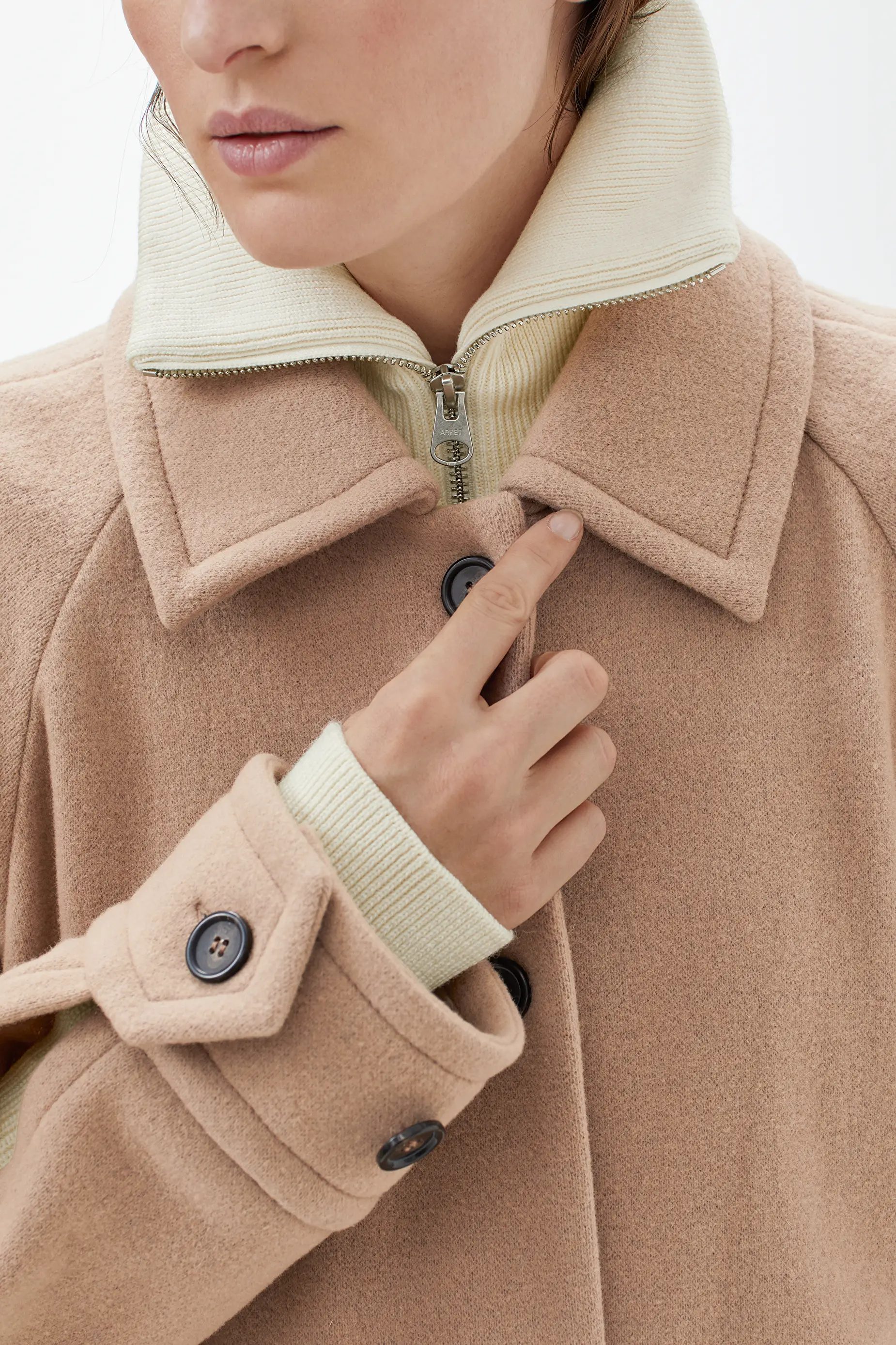 Arket merino jacket. Merino box jacket off white knitwear arket a knitted outerwear garment with a short and boxy shape flat collar two large patch pockets on the chest and a two way zip to easily adjust the fit and allow for layering. The elastic tapes inside the shoulders help the garment to keep shape. Made with a firm and compact half milano knit structure from a blend of rws certified merino wool and recycled polyester.