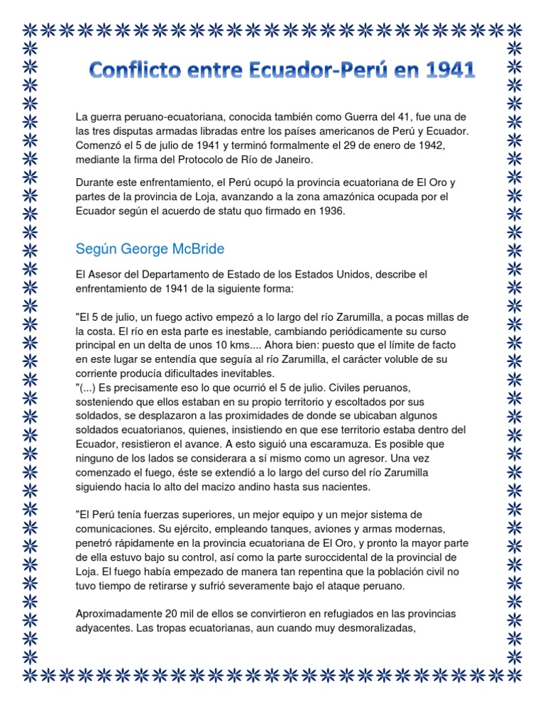 El conflicto peru ecuador de 1941 el ecuador en su desaforado y descabellado afan de apoderarse de los siempre peruanos rios maranon y amazonas inicia una serie de ofensivas que las agrava cuando instalaba puestos en zona peruana violando el statu quo de 1936 originando la guerra de 1941 que concluyo con una contundente victoria peruana habiendo recibido el ecuador una humillante derrota. 30 porque reconoce el estado posesorio del peru o sea su derecho a tumbes maynas y jaen. Guerra peruano ecuatoriana de 1941 guerra del 41 la guerra peruano ecuatoriana conocida tambien como guerra del 41 fue uno de diversos conflictos armados que ocurrieron entre los paises sudamericanos de peru y ecuador como consecuencia de su secular disputa territorial y por falta de fronteras reconocidas y aceptadas por ambos paises.