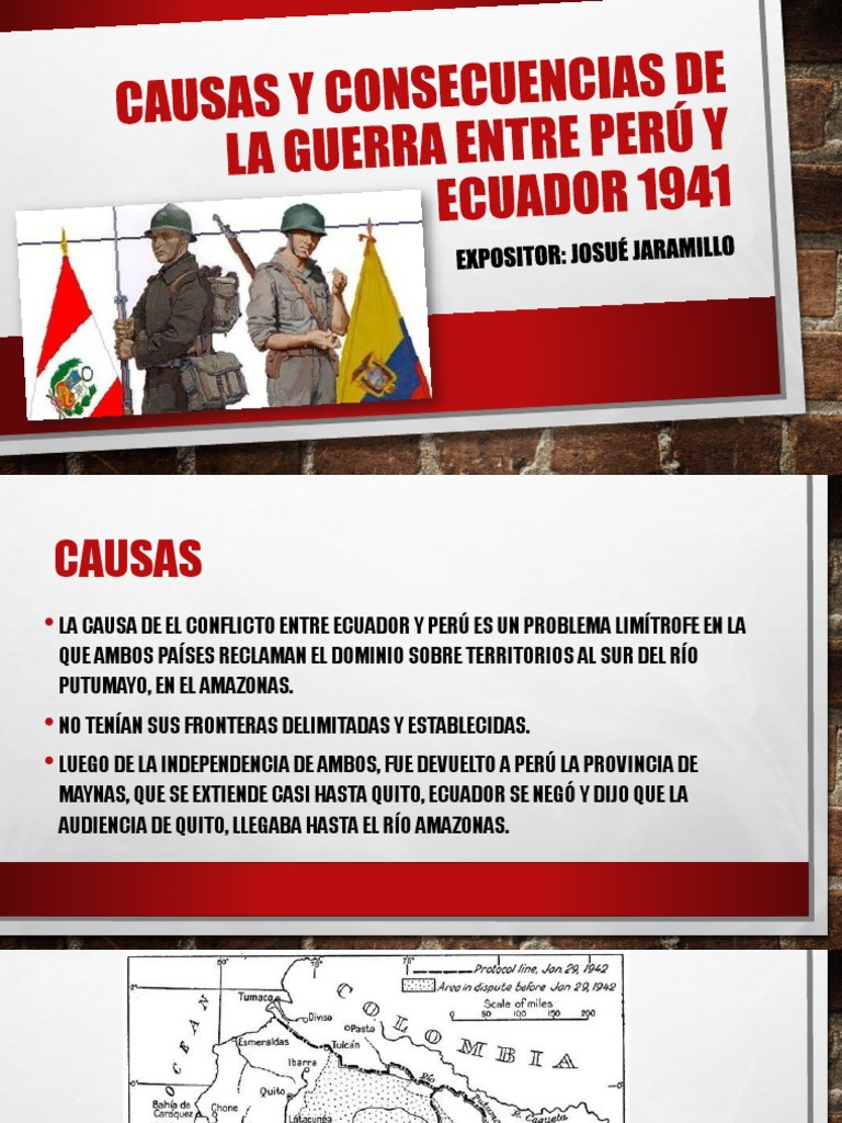 Guerra peruano ecuatoriana de 1941 guerra del 41 la guerra peruano ecuatoriana conocida tambien como guerra del 41 fue uno de diversos conflictos armados que ocurrieron entre los paises sudamericanos de peru y ecuador como consecuencia de su secular disputa territorial y por falta de fronteras reconocidas y aceptadas por ambos paises. Articulo 1o colombia se adhiere a la convencion de arbitraje. Conflicto armado peru ecuador de 1941llamado por los peruanos campana militar del norte y del nororiente de 1941 y llamado por los ecuatorianos guerra del 41 fue un conflicto armado y no guerra porque no hubo declaracion oficial de guerra entre los paises beligerantes peru y ecuadorcomenzo el 5 de julio de 1941 y termino el 12 de febrero de 1942 con la desocupacion hecha por el.