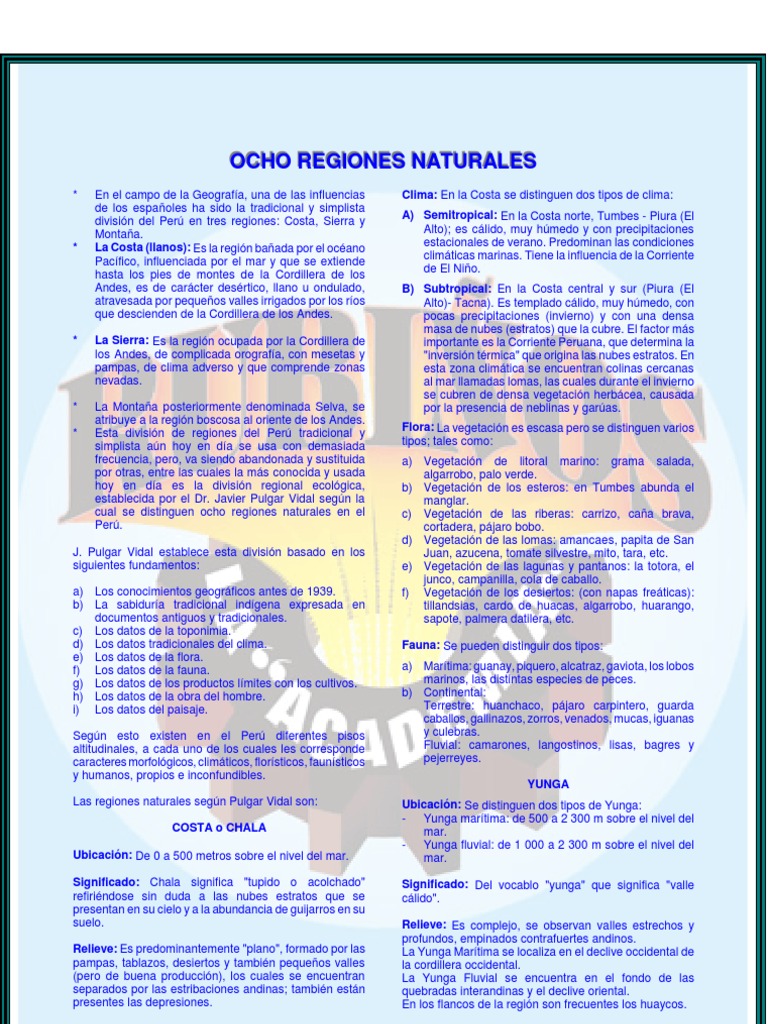 Cuales son las 8 regiones naturales del peru. Fichas de las 8 regiones naturales del peru para quinto grado de primaria keywords. Esta region es temida debido al soroche o mal de altura. Las 8 regiones naturales del peru.