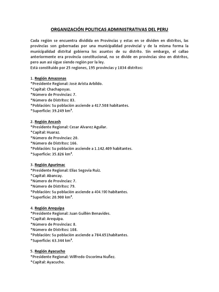 El peru cuenta con un extenso territorio tiene una superficie de 1 285 2156 km2 y se encuentra dividido en 24 departamentos y una provincia constitucional callao. La provincia constitucional del. Desde 2003 el peru cuenta con 26 circunscripciones de nivel regional.