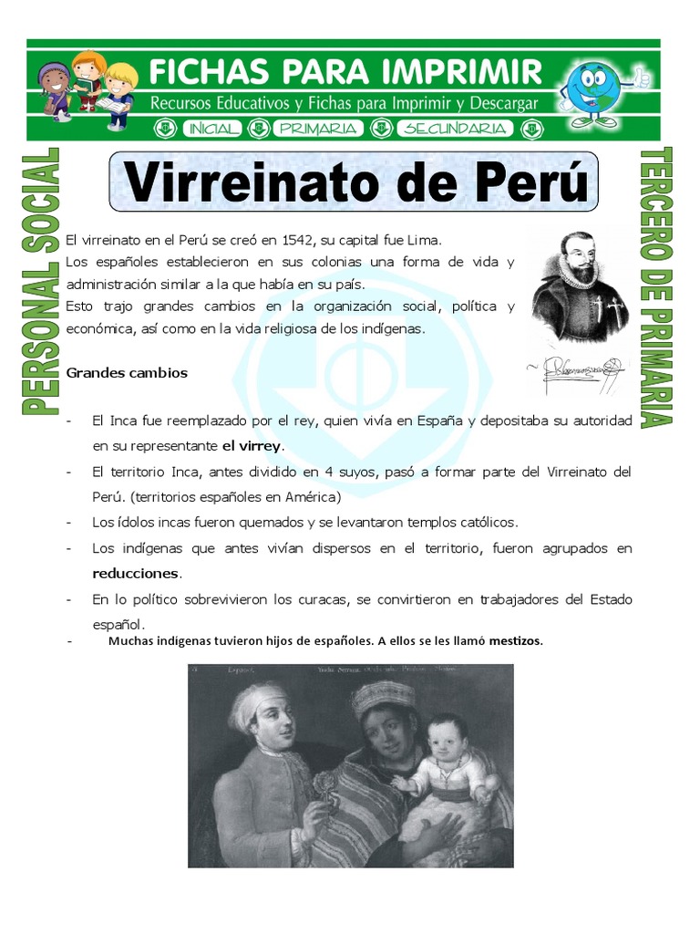Diapositivas del virreinato del peru para ninos de primaria. El virreinato de nueva espana fue creado el 8 de marzo de 1535 despues de la derrota de mexico fue creado con el objetivo de administrar este territorio donde posteriormente creceria para administrar tambien algunos territorios de norteamerica hasta llegar incluso a gobernar sobre territorios de centroamerica y algunos de asia. Ahora observaras una muestra de la 1era pagina de la ficha de esclavos y castas en el virreinato. Aqui te compartiremos la ficha de el virreinato del peru este material educativo fue preparado especialmente para ninos de segundo grado de primariaeste tema corresponde al curso de personal social y lo podras descargar gratis en formato pdf.