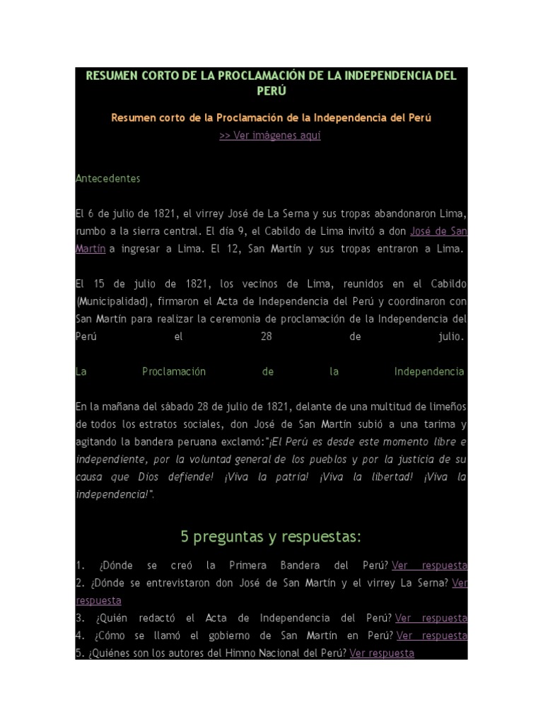 Los acontecimientos que llevaron a la creacion del nuevo pais tras siglos formando parte de la corona espanola comenzaron en 1810 dentro de un proceso de lucha por la independencia que afecto a todos los territorios espanoles de america. Haz clic aqui para obtener una respuesta a tu pregunta donde se proclamo la independencia del peru el 28 de julio de 1821 1.