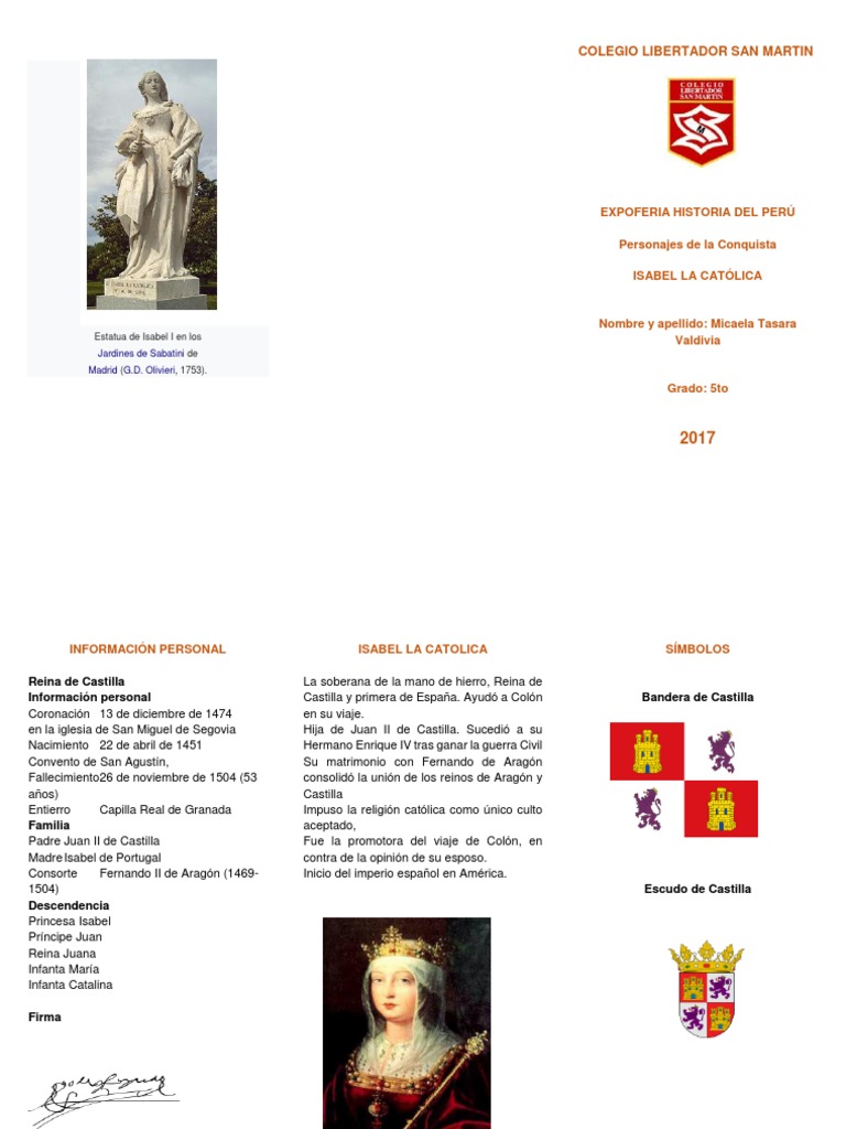 Isabel i de castilla madrigal de las altas torres 22 de abril de 1451 medina del campo real palacio testamentario 26 de noviembre de 1504 fue reina de castilla a desde 1474 hasta 1504 reina consorte de sicilia desde 1469 y de aragon desde 1479 2 por su matrimonio con fernando de aragontambien ejercio como senora de vizcayase la conoce tambien como isabel la catolica. Para muchos isabel i de castilla fue una mujer santa humilde llena de virtudes tanto politicas como humanas y para otros es considerada como una persona. A pesar de que su destino no era ocupar el trono tenia un hermano mayor por parte de padre enrique que heredaria el trono castellano pero tras su matrimonio con fernando de aragon se proclamo reina de castilla.