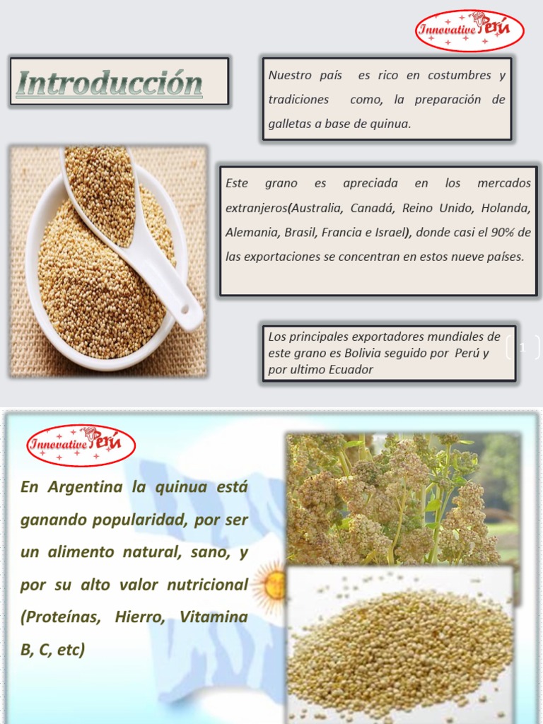 Proyecto de exportacion de galletas de quinua al mercado de estados unidos. Este mercado emplea y le da un valor agregado a la quinua en diversas presentaciones. Galletas de quinua y naranja.