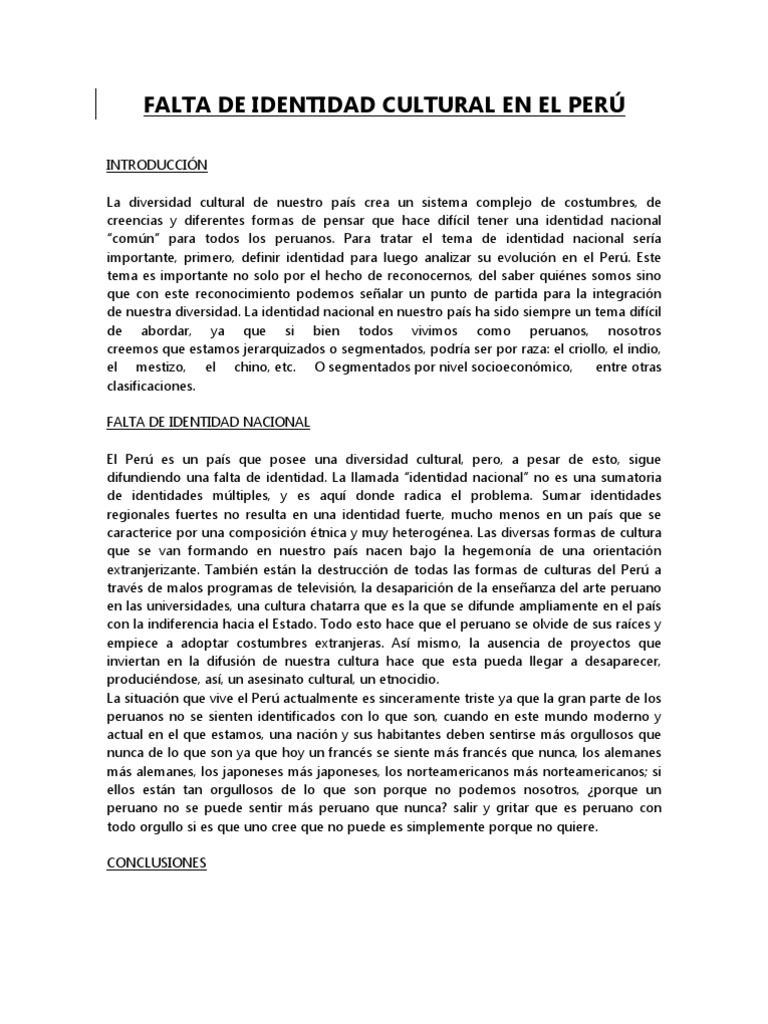 Por lo tanto mucho de esto es adquirido siendo necesario para tener una mejor idea de lo que adquirimos analizar la. La llamada identidad nacional no es una sumatoria de identidades multiples y es alli donde radica el problema. Identidad cultural en el peru.