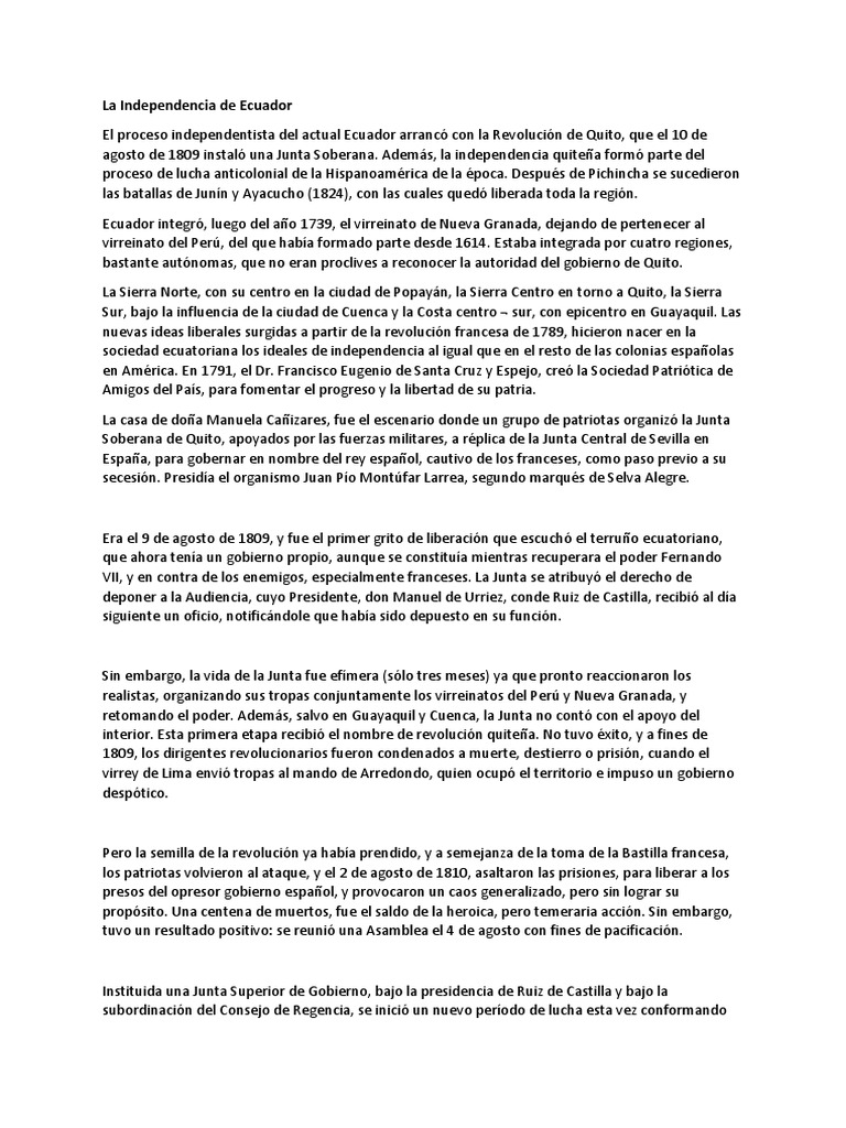 La guerra de independencia de ecuador es un proceso independentista con el objetivo de romper los lazos coloniales entre la real audiencia de quito y el imperio espanol en el contexto de guerras de independencia hispanoamericanasla independencia de guayaquil el 9 de octubre de 1820 marca el comienzo de la guerra de independencia de la real audiencia de quito que termina con la batalla de. El virreinato del peru y el virreinato de nueva espanaen ese ano como parte de las reformas borbonicas del rey felipe v en la ciudad de segovia espana se escinde del virreinato del peru uno nuevo el virreinato de nueva granada medida decretada el 27 de mayo de 1717 por. Hasta antes de 1717 el territorio americano del imperio espanol estaba dividido en dos grandes dependencias.