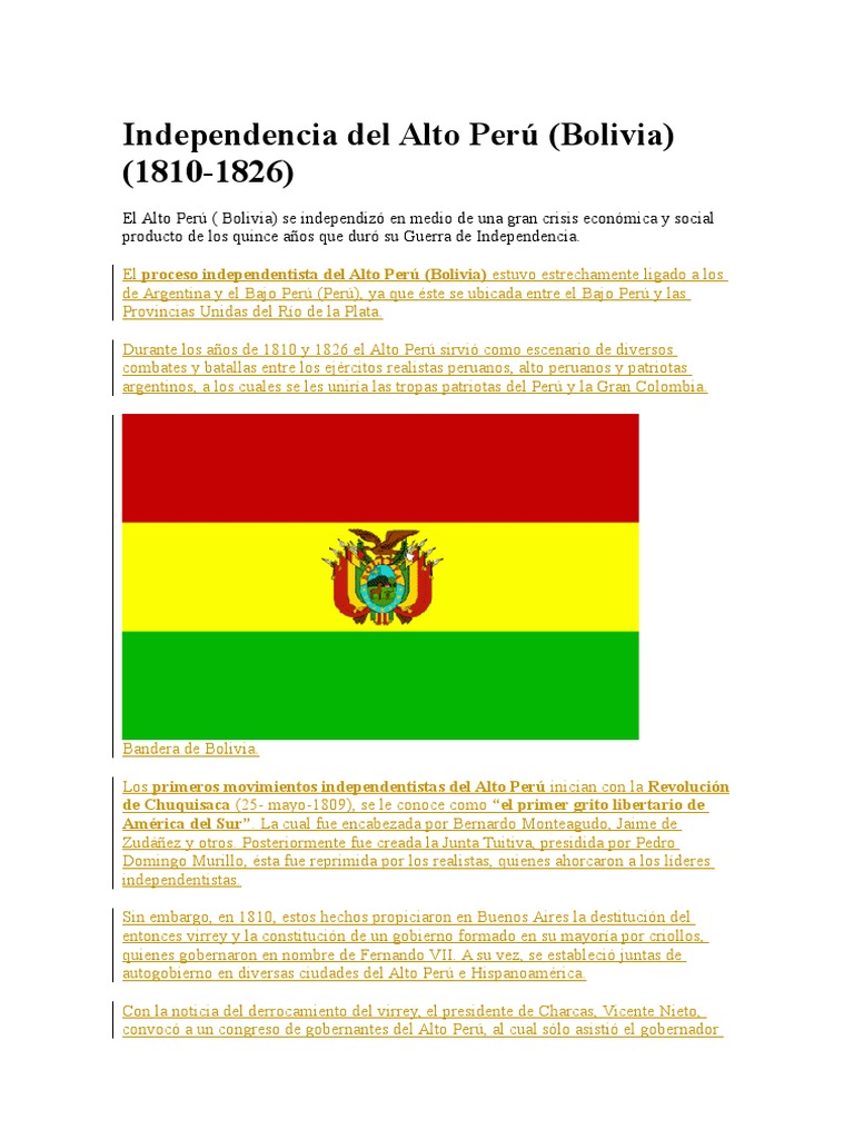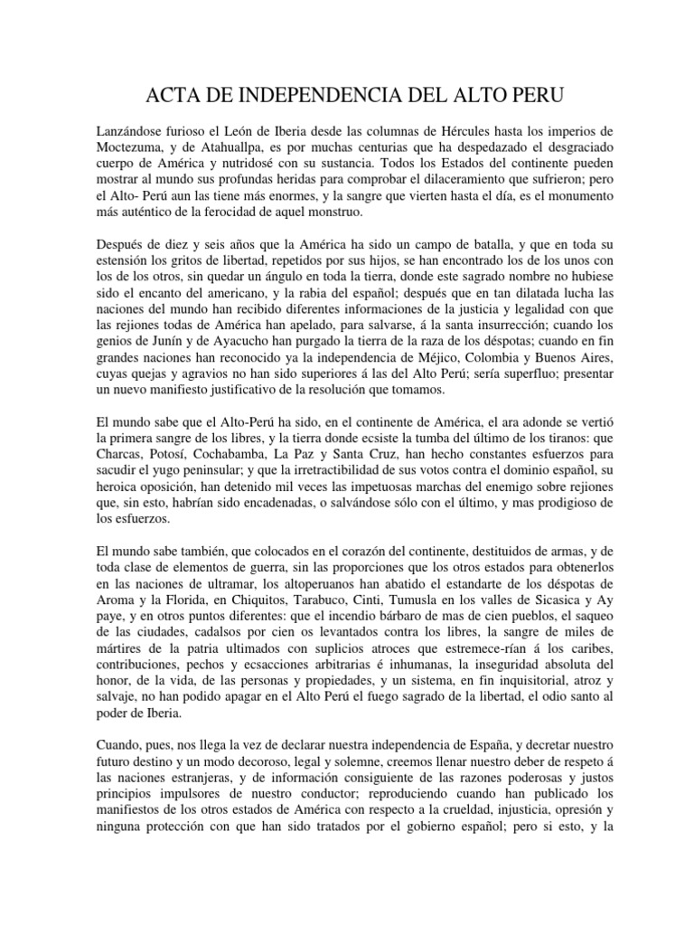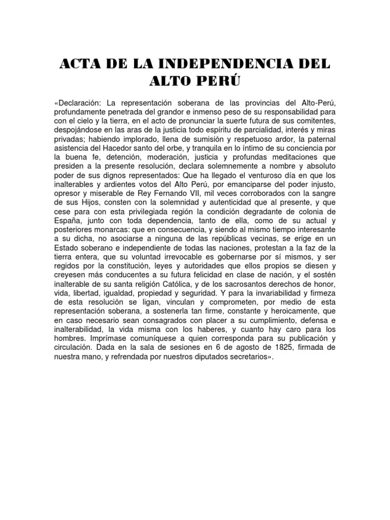 Descendiente de los incas del cuzco lidero una rebelion que se extendio por un gran territorio del peru y alto peru pero que fue sofocada por los espanoles quienes lo asesinaron. El proceso independentista del alto peru bolivia estuvo estrechamente ligado a los de argentina y el bajo peru peru ya que este se ubicada entre el bajo peru y las provincias unidas del rio de la plata. Convocada nuevamente la asamblea deliberante en chuquisaca el 9 de julio de 1825 y concluida se determino la completa independencia del alto peru bajo la forma republicana por soberana de sus hijosfinalmente el presidente de la asamblea jose mariano serrano junto a una comision redacto el acta de la independencia que lleva fecha del 6 de agosto de 1825 en honor a la batalla de.