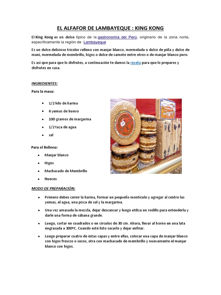 1 pizca de sal. Hoy es el dia ideal para disfrutar de un buen postre por eso te compartimos la receta del famoso king kong peruano. Por el ano 1933 se estreno la pelicula del gigantesco gorila que se toma el empire state y fue en la misma epoca cuando en peru especificamente en.