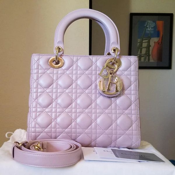 Diors iconic bag the lady dior features all the hallmarks of dior leather goods. The shoulder bag features sturdy top handles and an optional shoulder strap with silver tone hardware including signature dior initials charms. Soft lambskin topstitched with the iconic cannage motif rounded handles and dior charms.