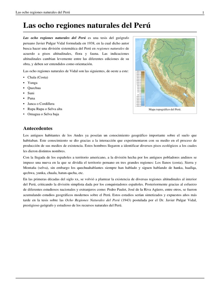 Es una tesis que fue presentada por el geografo peruano javier pulgar vidal en la tercera asamblea general del instituto panamericano de geografia e historia reunida en lima en 1941. Las ocho regiones naturales del peru es una tesis del geografo peruano javier pulgar vidal formulada en 1938 en la cual dicho autor busca hacer una division sistematica del peru en regiones naturales de acuerdo a pisos altitudinales flora y fauna 1.