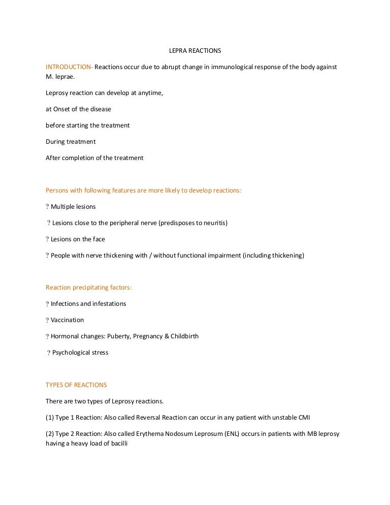 Skin type 1 reaction type 2 reaction inflammation of the skin leprosy patches are inflamed but rest of the skin normal. Lepra reaction and neuritis. Poor with fever and.