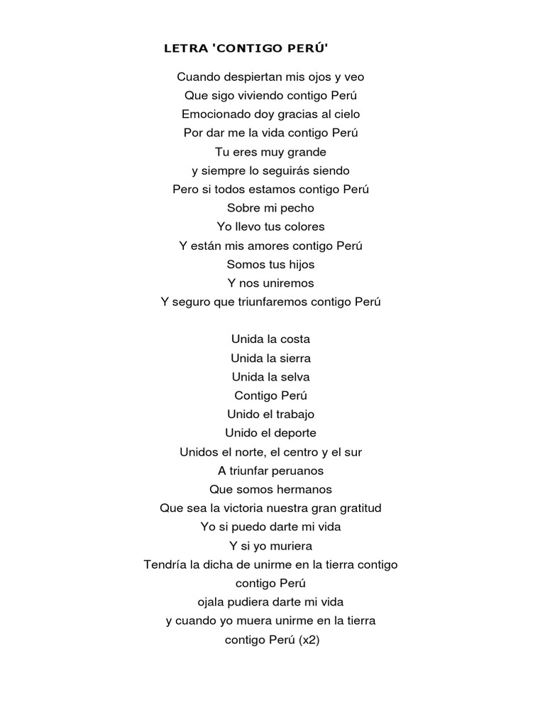 Tu eres muy grande y lo seguiras siendo. Por dar me la vida contigo peru tu eres muy grande y siempre lo seguiras siendo pero si todos estamos contigo peru sobre mi pecho yo llevo tus colores y estan mis amores contigo peru somos tus hijos y nos uniremos y seguro que triunfaremos contigo peru unida la costa unida la sierra unida la selva contigo peru unido el trabajo. Letra de contigo peru.