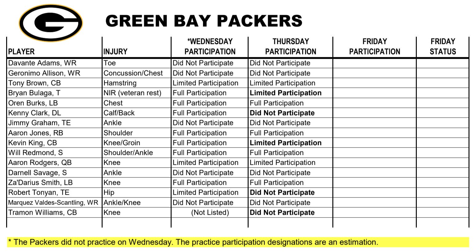 The pro bowl defensive lineman missed practice again. Davante adams who has been out since week 2 and kenny clark missing since week 1 were both full participants.