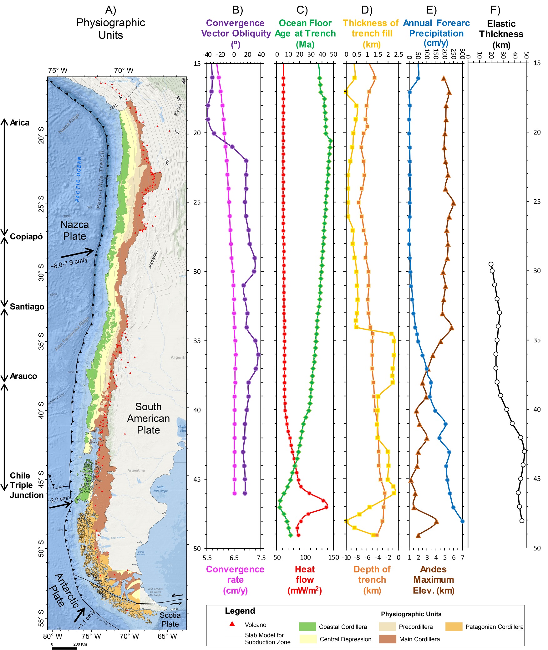 The peru chile trench marks the subduction of the nazca plate under the south american plate and lies offshore from an area of active volcanism.
