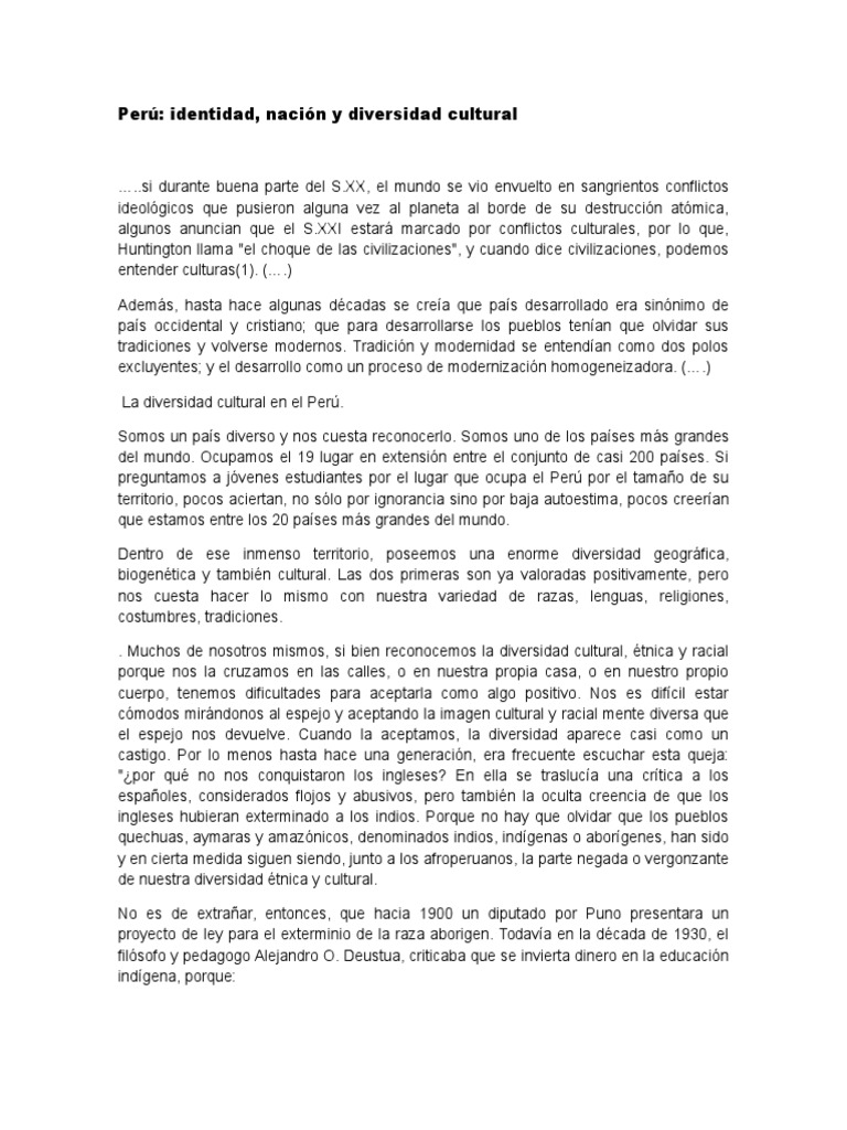 Peru identidad nacion y diversidad cultural. La construccion de una nacion pluricultural primer paso para la construccion de un pais pluricultural. Sobre la diversidad cultural del peru su importancia para la sociedad peruana. Estando en el mes jubilar que celebramos los 177 anos de la proclamacion de la independencia del peru como fue la memorable fecha del 28 de julio del ano 1821 realizado por un ilustre militar sudamericano argentino el graldon jose de san martin.