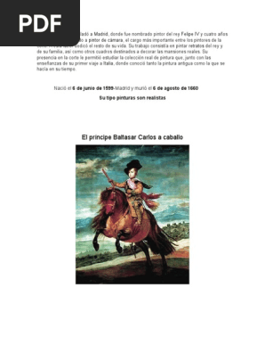 Velazquez habia recibido el encargo de pintar una serie de retratos ecuestres que se destinarian al salon de reinos del palacio del buen retiro de madrid. El retrato de el principe baltasar carlos a caballo fue pintado por diego velazquez en 1635 y se conserva en el museo del prado. 209 cm 173 cm.