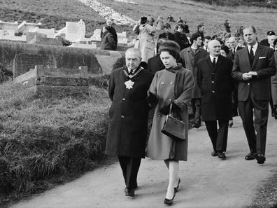 La reina en su visita a las victimas de aberfan en 1966. El 21 de octubre de 1966 una avalancha de lodo procedente de una escombrera cayo sobre el pueblo de aberfan en gales matando a 144 personas. Y esto no es todo.