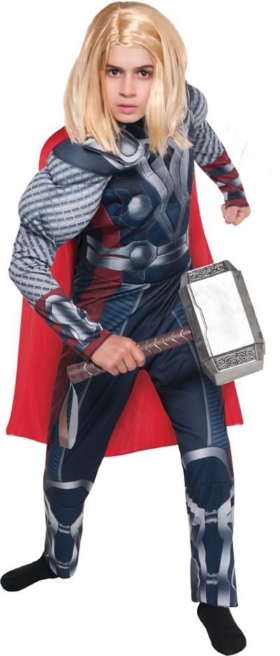 Channel the might of mjolnir with this action packed thor hammer. The ensemble features a gray polyester jumpsuit printed to look like the hammer wielding gods signature armor. This molded plastic thor hammer features authentic movie character styling with a steel like beveled head and a banded leather look handle finished by a vinyl strap.